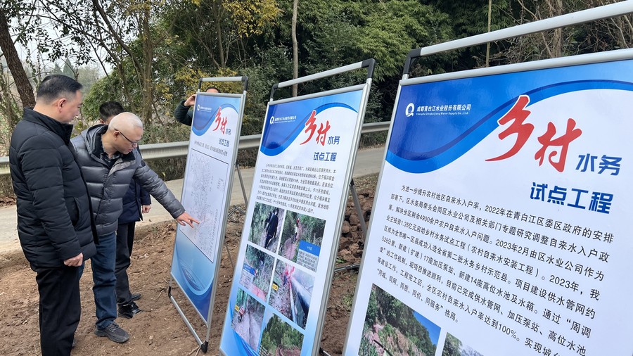 尹曉東一行首先前往青白江水業(yè)公司鄉(xiāng)村水務(wù)試點工程點位,查看了高位水池、加壓站運維及自來水到組到戶情況。
